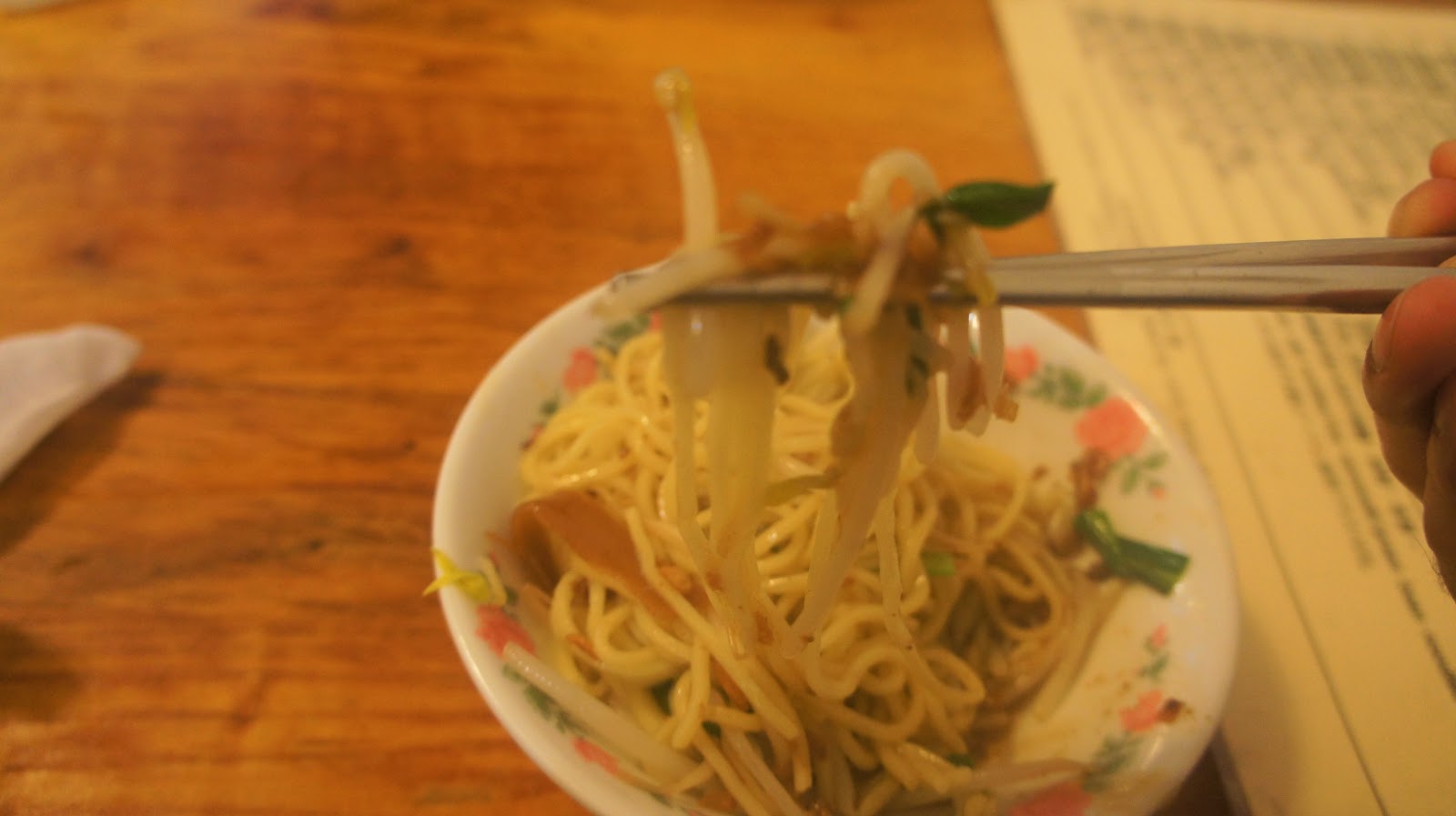 もやし、ニラ、炒めたお肉ににんにくが効いている麺です。